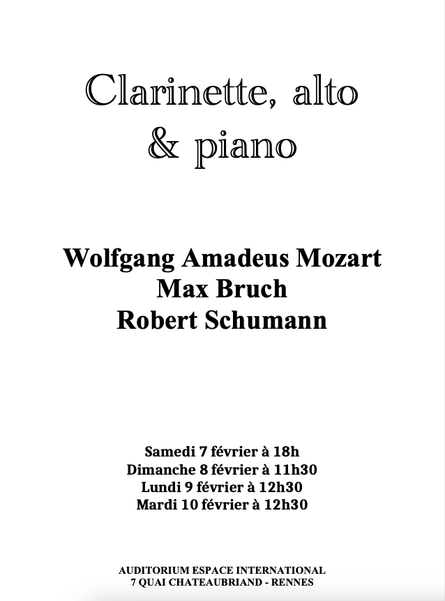 C’est à l’intention de ce dernier et en hommage à Schumann que Bruch a composé entre 1906 à 1910 les pièces pour piano, clarinette et alto (ou violoncelle) op.83. Il s’agit de compositions qui, dans une forme claire et ramassée, montrent la quintessence de sa pensée, nourrie de romantisme et de l’expression raréfiée du classicisme, ainsi que Brahms l’a proposé dans ses derniers opus de piano. L’inspiration se manifeste dans l’art de la demi-teinte, du nocturne ou bien même de l’anecdote comme l’indique la mélodie roumaine (n° 5), ultime concession de Bruch à un folklore qu’il avait aimé intégrer dans ses œuvres, dans sa Fantaisie écossaise notamment. Bruch a noté un dispositif instrumental alternatif, indiquant, comme Schumann l’avait fait avant lui, la possibilité de remplacer la clarinette par le violon, l’alto par le violoncelle. Le recueil a été créé en 1909 à Cologne puis à Hambourg par Max Félix Bruch, Willy Hess et l’auteur au piano.